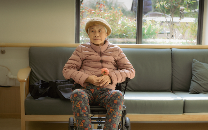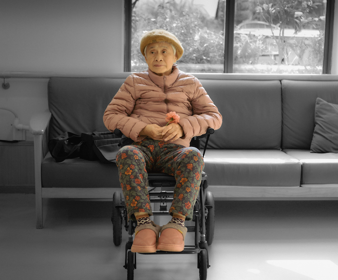 代奶奶静静地坐在轮椅之上,周身被日光勾勒出一层柔和的轮廓,宛如一幅被岁月珍藏的剪影。